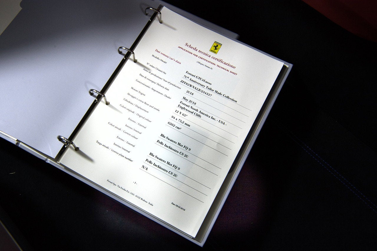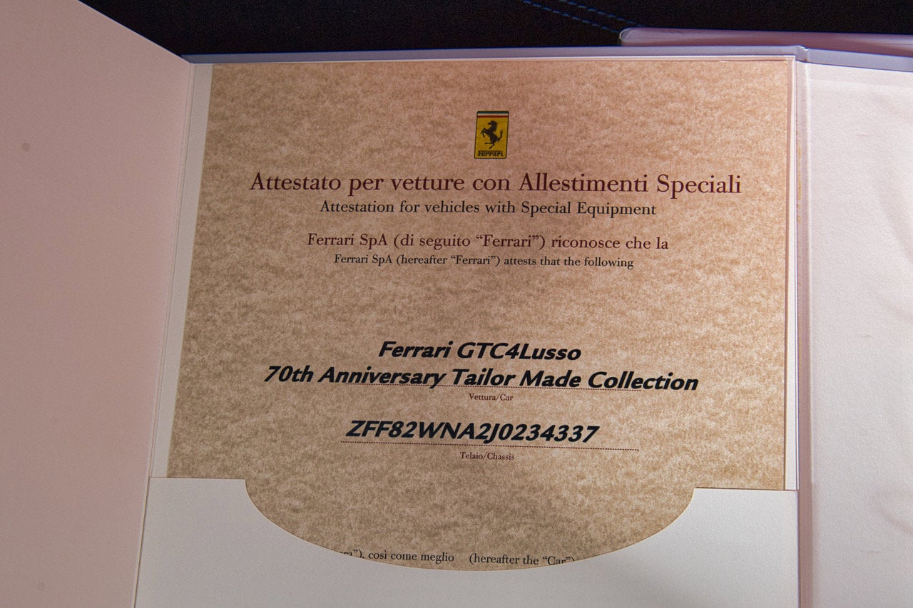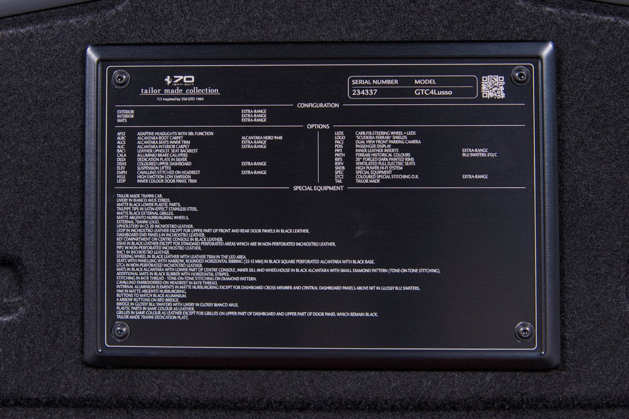 We are proud to present this one-owner, Tailor Made 2018 GTC4Lusso V12 70th Anniversary Edition that has covered only 2,984 miles and has a clean CarFax. The Lusso V12 was purchased new from Ferrari of Houston and by a long time, Ferrari collector. This Ferrari has completed a comprehensive 101-point Ferrari Approved inspection, with all updates, recalls, and service bulletins completed. This certified GTC4Lusso V12 will come with Ferrari warranty until 7/24/2028. It is complete with all keys, books/manuals, car cover and battery charger. We offer a number of attractive financing programs through Ferrari Financial Services, including extended financing terms of up to 84 months, leasing, and balloon loan options that offer the flexibility of ownership with the affordable monthly obligation of a lease. Contact us today and let Ferrari of Houston structure a program for you. AFS2ADAPTIVE FRONT LIGHTS + SBL ALBCALCANTARA BOOT CARPETALCANTARA NERA 9440 ALCSALCANTARA SEATS INNER TRIMEXTRACAMPIONARIO-NOT STANDARD ALICALCANTARA INTERIOR CARPETEXTRACAMPIONARIO-NOT STANDARD ATTCDRAWING ATTACHED BAC1LEATHER UPHOLST. SEAT BACKREST CALAALLUMINUM BRAKE CALIPERS CONFORDINE TAILOR MADE CONFERMATO CRPTCarpets colorsEXTRACAMPIONARIO-NOT STANDARD DEDIDEDICATION PLATE IN SILVER DSH5COLOURED UPPER DASHBOARDEXTRACAMPIONARIO-NOT STANDARD ELEVSUSPENSION LIFTER EMPHHORSE STITCHED ON HEADRESTEXTRACAMPIONARIO-NOT STANDARD EXTCExternal colorsEXTRACAMPIONARIO-NOT STANDARD HELEHIGH EMOTION LOW EMISSION INTCInternal colorsEXTRACAMPIONARIO-NOT STANDARD LEDLLEDS STW ARCHES COVER LEATHER LEDPINNER COLOUR DOOR PANNEL TRIM LEDSCARB.FIB.