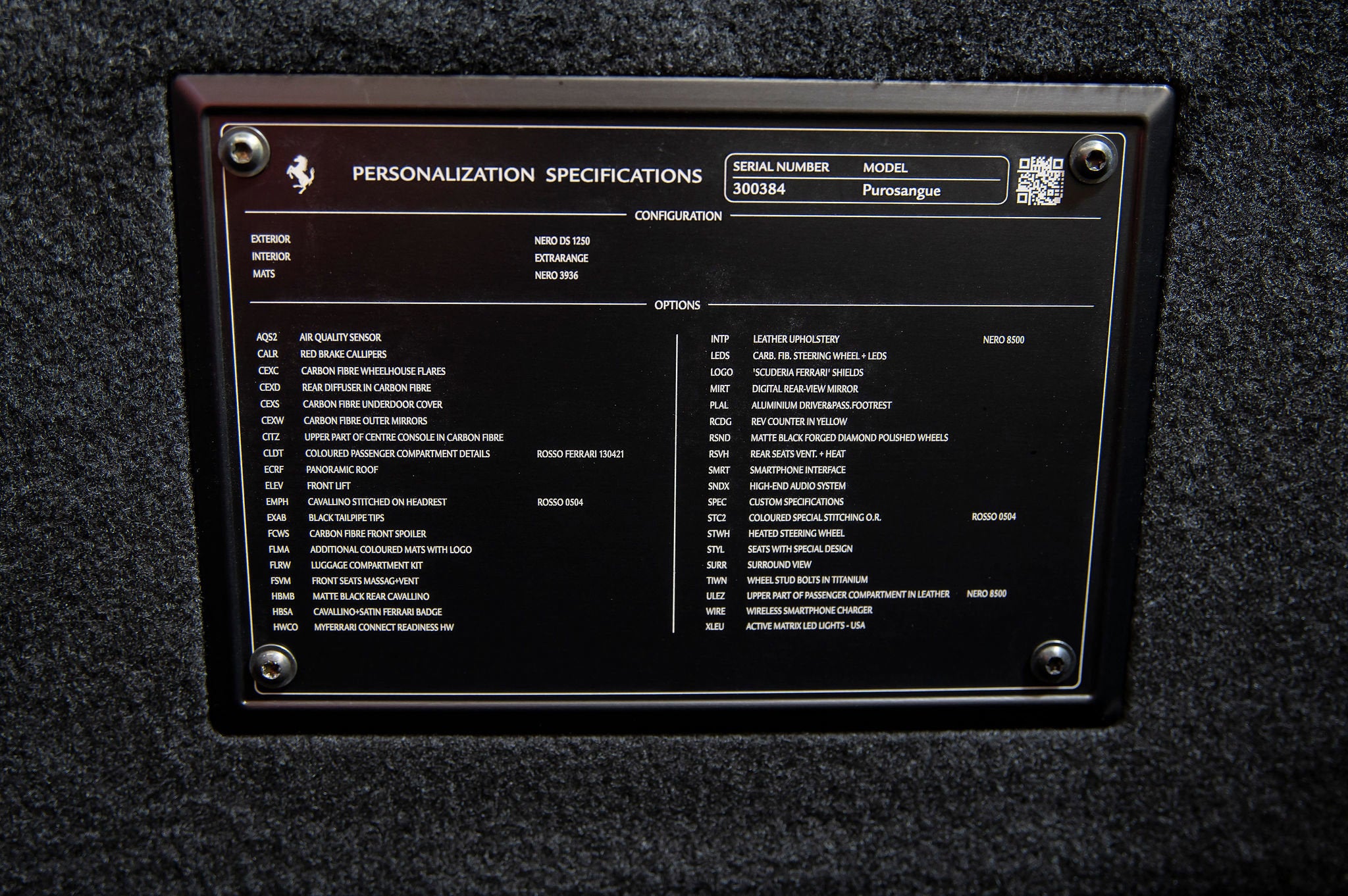 Ferrari of Houston is thrilled to offer this stunning 2024 Ferrari Approved Certified Purosangue, acquired from the extensive collection of a longtime Ferrari of Houston client, and features an extensive list of desirable factory options (see below). The Ferrari Purosangue is Ferraris first-ever four-door SUV, blending supercar performance with luxury and practicality. Powered by a 6.5L naturally aspirated V12 producing 715 hp, it offers blistering speed, a refined all-wheel-drive system, and adaptive suspension for superior handling. This Purosangue comes with Ferrari warranty until 5/17/2028 and no cost annual maintenance until 5/17/3031. It has completed a comprehensive 101 Point Ferrari Approved inspection, has had all recalls/technical updates performed, and is complete with all keys, books, tools, car cover, and battery charger. We offer a number of attractive financing programs through Ferrari Financial Services, including extended financing terms, and a popular 60 month balloon program. Please contact us if we can structure a financing quote to best meet your financial objectives. AQS2AIR QUALITY SENSORS CALRRED BRAKE CALIPERS CEXCWHEEL ARCH IN CARBON FIBRE CEXDREAR DIFFUSER IN CARBON FIBRE CEXSCARBON FIBRE UNDERDOOR COVER CEXWCARBON FIBRE OUTER MIRRORS CITZCARBON FIBRE UPPER TUNNEL TRIM CLDTCOLOURED INNER DETAILSROSSO FERRARI 130421 CRPTCarpets colorsNERO 3936 ECRFPANORAMIC ROOF ELEVSUSPENSION LIFTER EMPHHORSE STITCHED ON HEADRESTROSSO (RED) 0504 EXABBLACK CERAMIC EXHAUST PIPES EXTCExternal colorsNERO DS 1250 FCWSCARBON FIBRE FRONT SPOILER FLMACOLOURED MATS WITH LOGO FLRWKIT BAULE FSVMSEDILI ANTERIORI MASSAG+VENT HBMBREAR PRANCING HORSE MATT BLACK HBSASATIN PRANC HORSE+FERRARI BADG HWCOHW READINESS MYFERRARI CONNECT INTCInternal colorsEXTRACAMPIONARIO-NOT STANDARD INTPLEATHER UPHOLSTERYNERO 8500 (BLACK) LEDSCARB.FIB.STEERING WHEEL + LEDS LOGO'SCUDERIA FERRARI' SHIELDS MIRTDIGITAL REARVIEW MIRROR PLALALUMINIUM DRIVER&PASS.FOOTREST PPACPERSONALIZATION PACK RCDGREV COUNTER IN GIALLO RSNDCERCHIO FORGIATO DIAM NERO OPA RSVHSEDILI POST. VENT.