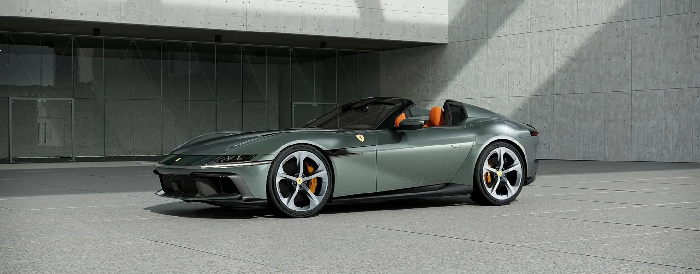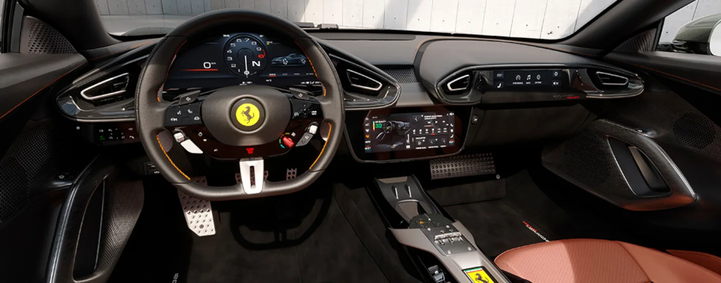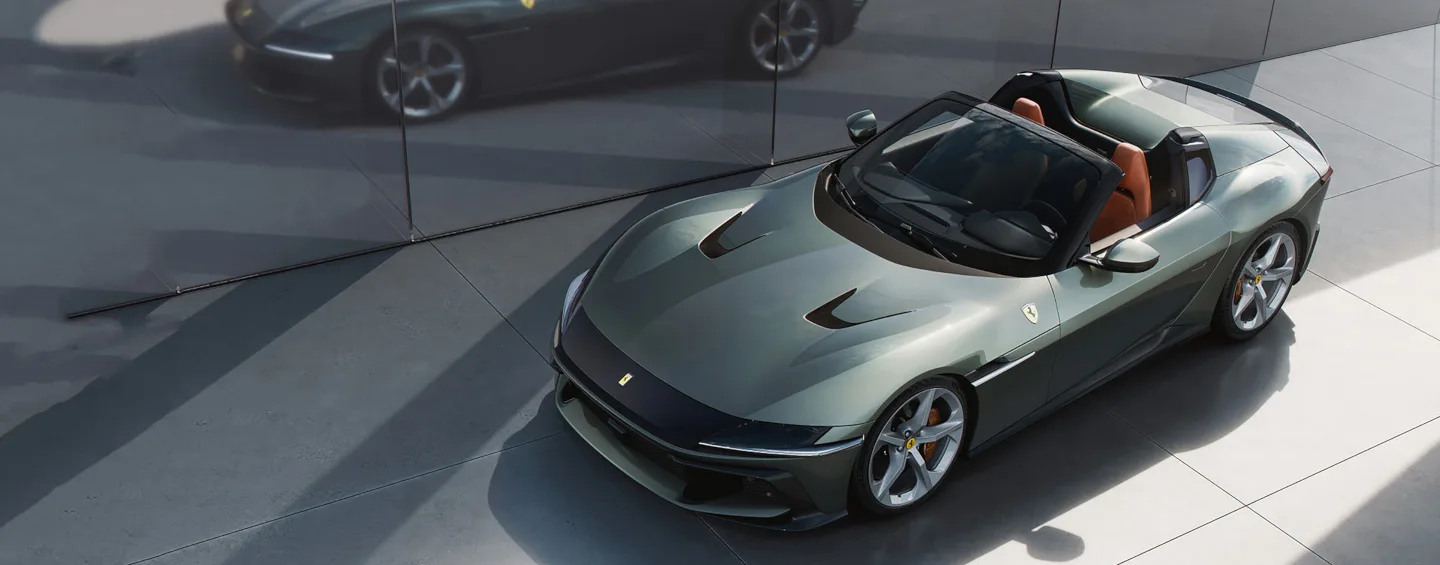 This car differs from the Ferrari 12Cilindri in the boldly expressive character created by the two buttresses at the rear, behind which an element with a black-screen effect is set. The crease lines evident on the buttresses clearly echo the motif of the flank, accentuating the expressiveness of the design of these elements. Set into the flank is a ‘quarterlight’ in back-painted polycarbonate. 12Cilindri Spider is stunningly beautiful, and with the top open immerses the driver into the world around them for maximum driving pleasure.